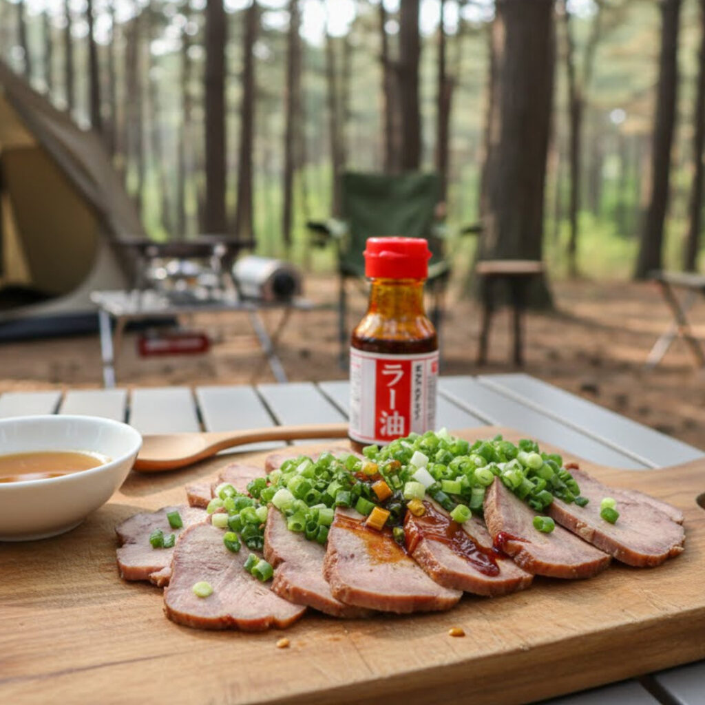 ②小口切りにしたネギをスモークタンにのせて、ポン酢、ラー油をかけて完成