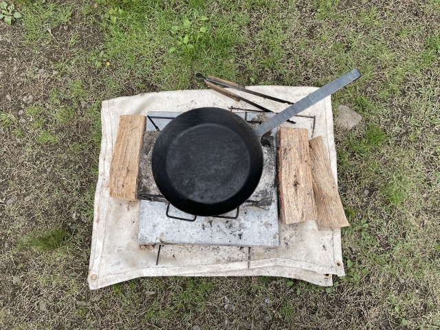 焚き火やバーナーの弱めの火のそばに置いて、2〜3分ほど温めます。